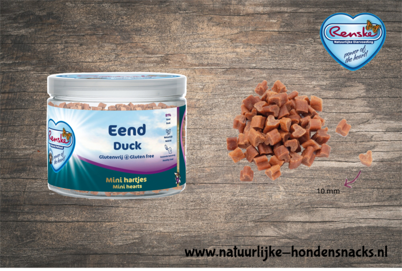 RENSKE Mini Hartjes Eend (100 gr)Een heerlijke beloning voor uw hond, Renske Gezonde Beloning Mini Hartjes Eend! Klein formaat, fijn om mee te trainen.